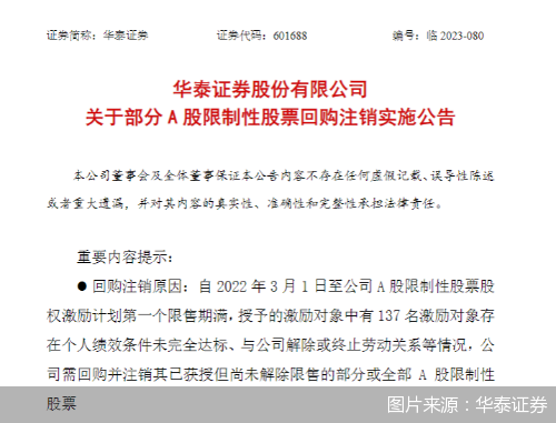 华泰证券表示其已在中国证券登记结算有限责任公司上海分公司开设了回购专用证券账户,并已申请办理回购注销手续,上述92.57万股尚未解除限售的A股限制性股票预计将于2023年9月22日完成注销。