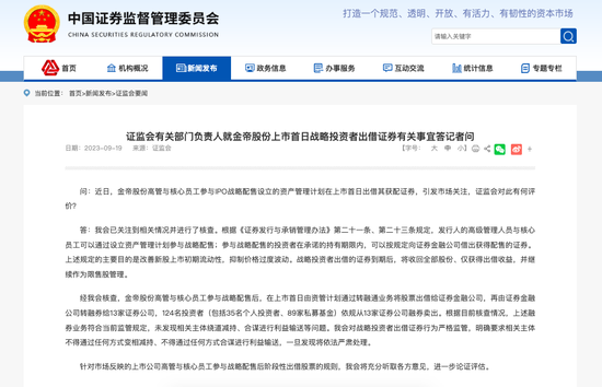 据证监会官网,有提问称,金帝股份高管与核心员工参与IPO战略配售设立的资产管理计划在上市首日出借其获配证券,引发市场关注,证监会对此有何评价?