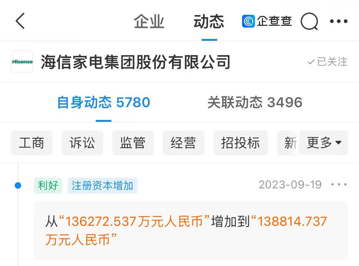 海信家电注册资本从13.63亿元增至13.88亿元,增幅1.83%