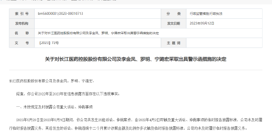 涉信息披露违法违规 长药控股及相关高管被出具警示函