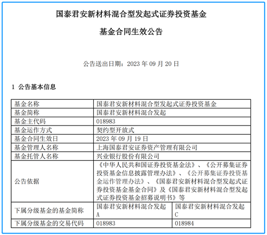 公开资料显示,近日,国泰君安新材料混合型发起式基金宣布成立,该基金募集期仅9月15日一天,托管银行为兴业银行。