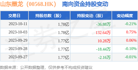 山东墨龙(00568.HK):10月11日南向资金减持36.88万股