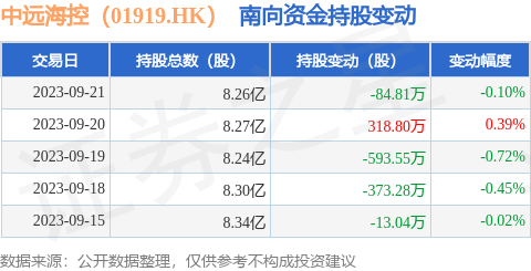 中远海控(01919.HK):9月21日南向资金减持84.82万股