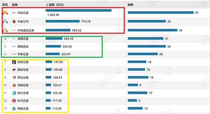 wind显示,国信证券2022年的IPO承销保荐项目数量为15个,排名第十;合计承销金额139.65亿元,排名第八。而第一梯队(承销额500亿元以上)的中信证券、中金公司、中信建投,2022年的IPO承销金额分别为1502.55亿元、778.76亿元、568.52亿元,承销保荐项目数量分别为57家、33家、43家,国信证券难以望其项背。