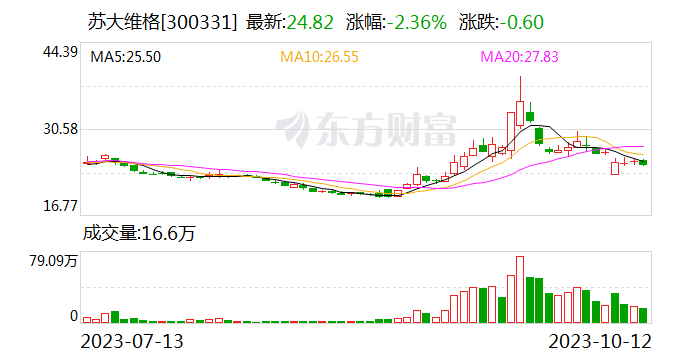 在9月18日-10月12日这近13个交易日,苏大维格股价区间累计跌幅达29.09%,同期大盘涨幅0.24%。截至10月12日收盘,苏大维格股价报24.82元/股,当日收跌2.36%,总市值为64.45亿元。