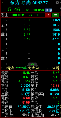 9月18日消息,东方时尚开盘一字跌停,截止发稿,股价报5.46元,最新总市值为39.35亿元。