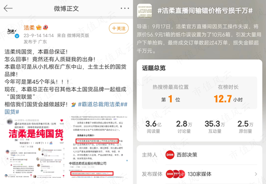 不过,还没等这泼天富贵轮到老国货洁柔纸巾,洁柔便先以另一种悲催方式出了圈,“洁柔直播间输错价格亏损千万”话题直接登顶微博热搜。