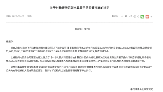 近日,中国证监会北京监管局披露《关于对杨振华采取出具警示函监管措施的决定》的公告。公告显示,飞利信董事长杨振华短线交易公司股票,被证监局出具警示函并记入证券期货市场诚信档案。