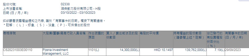 Pzena投资管理(PZN.US)增持1430万股潍柴动力(02338) 最新持股比例7.19%