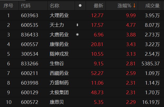 上证报中国证券网讯 12月18日,中药板块快速拉升,截至9时44分,大理药业涨停,天士力、大唐药业、康缘药业等涨超3%。