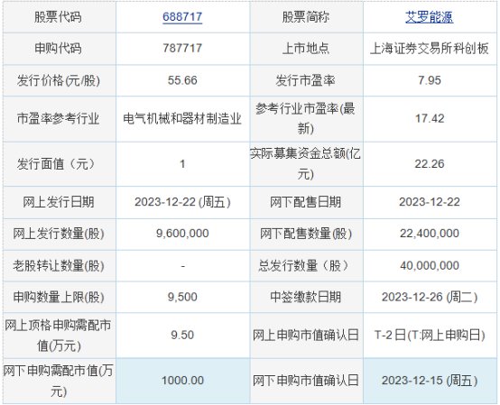 艾罗能源2023年12月21日披露首次公开发行股票并在科创板上市发行公告,公司本次募投项目预计使用募集资金金额为80,872.25万元。按本次发行价格55.66元/股和4,000.00万股的新股发行数量计算,若本次发行成功,预计公司募集资金总额222,640.00万元,扣除约23,832.55万元(不含税)的发行费用后,预计募集资金净额为198,807.45万元(如有尾数差异,为四舍五入所致)。