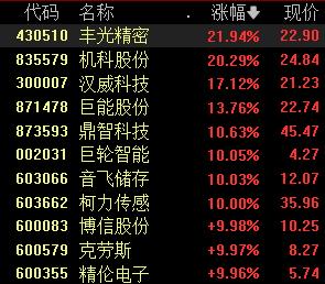 12月13日,机器人板块异动拉升,截至发稿,丰光精密、机科股份涨超20%,巨能股份涨超13%,鼎智科技、巨轮智能、音飞储存、柯力传感等多股涨停。