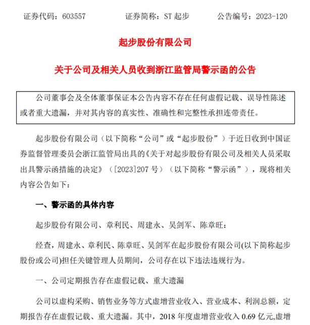 近日,起步股份公告称,收到中国证券监督管理委员会浙江监管局(以下简称“浙江监管局”)出具的警示函,其中对公司及相关人员违法行为采取的措施做出了说明。