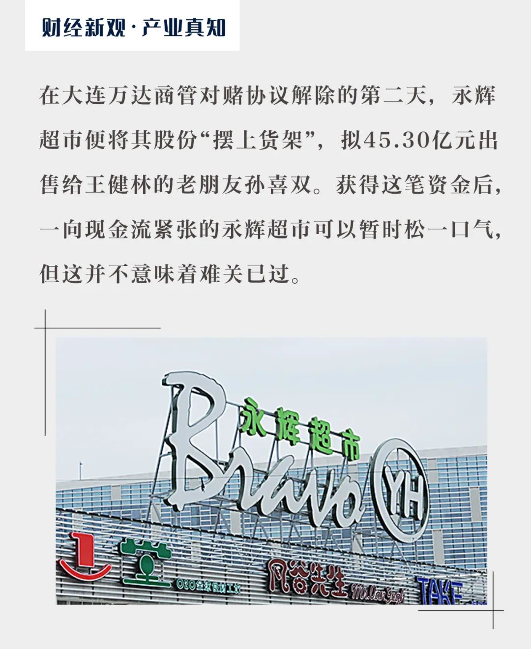 这一消息发布次日,永辉超市便宣布,拟出售大连万达商管1.43%股份,转让价格高达45.30亿元,接盘方正是王健林老朋友孙喜双实控的大连一方。