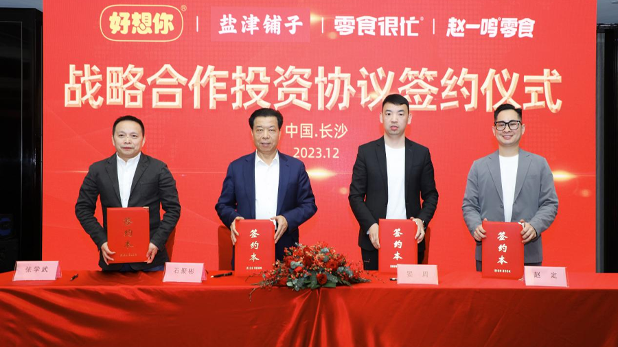 12月18日,好想你(002582.SZ)、盐津铺子控股(002847.SZ)、零食很忙、赵一鸣零食共同在湖南长沙签署战略合作投资协议,宣布好想你和盐津铺子控股分别向零食很忙集团投资7亿和3.5亿,分别取得6.64%和3.3175%股权,零食很忙集团新获得10.5亿投资。