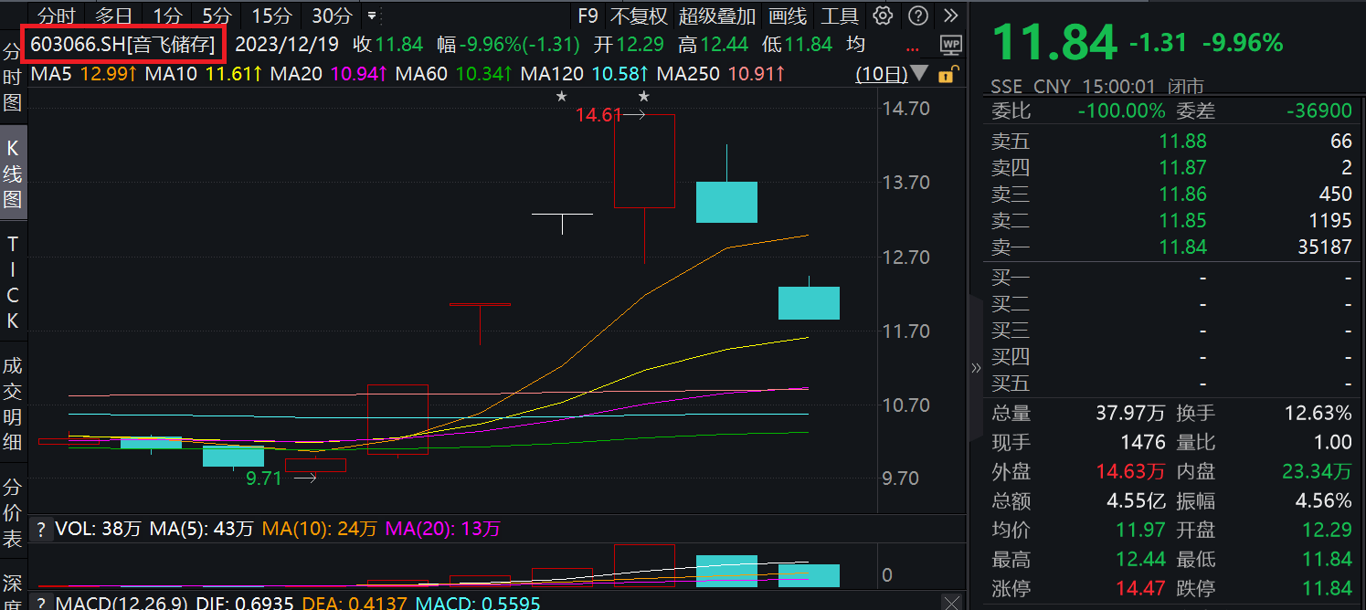 12月19日,音飞储存以12.29元开盘,此后反复震荡,一度还反弹至12.44元。就在市场以为音飞储存不会再跌停之时,该股在午盘后很快就被大量卖单打到跌停,最终以下跌9.96%报收11.84元,迎来了连续第二个跌停日。