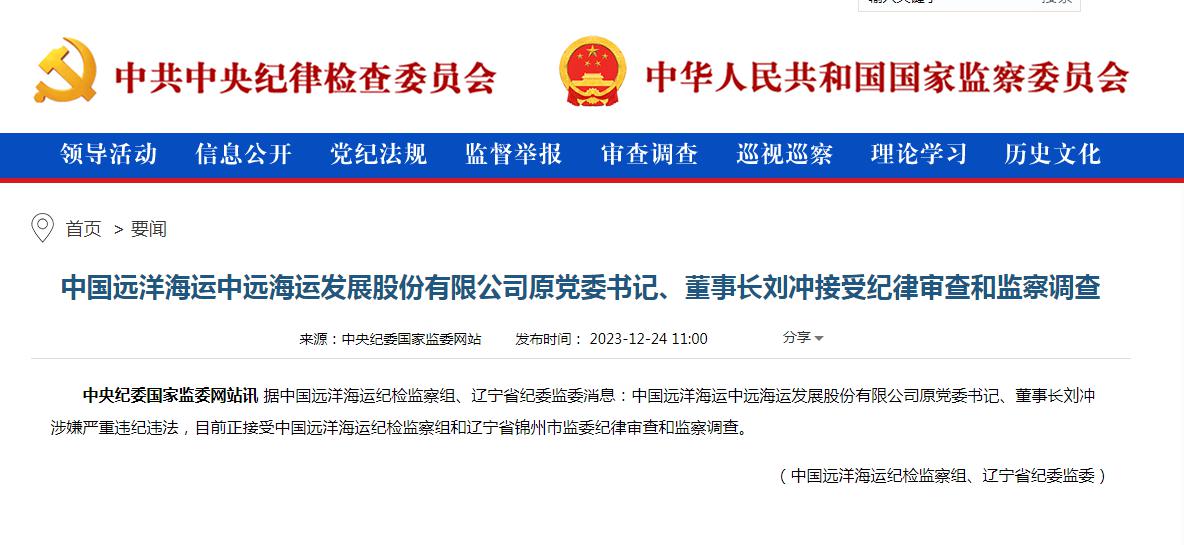 中新经纬12月24日电 中央纪委国家监委网站24日通报,中国远洋海运中远海运发展股份有限公司(下称中远海发)原党委书记、董事长刘冲涉嫌严重违纪违法,目前正接受中国远洋海运纪检监察组和辽宁省锦州市监委纪律审查和监察调查。