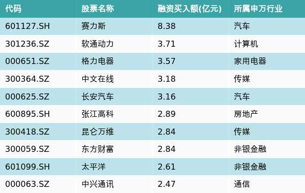 12月20日,两市共有3311只个股有融资资金买入,其中赛力斯、软通动力、格力电器排名前三,买入金额分别8.38亿元、3.71亿元、3.57亿元。融资买入额前10个股详情见下表: