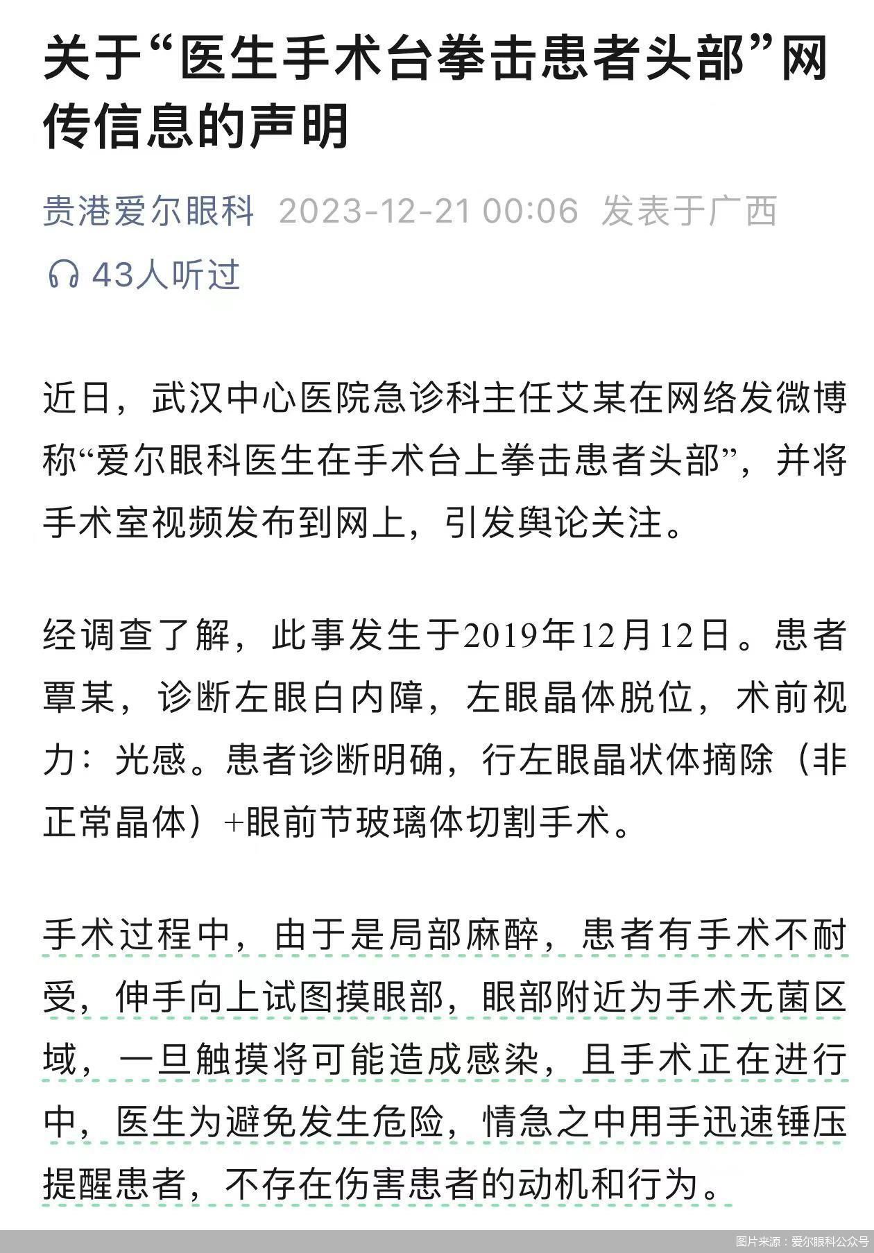 对于爆料的内容,贵港爱尔眼科公众号发布《关于“医生手术台拳击患者头部”网传信息的声明》称,经调查了解,此事发生于2019年12月12日。患者覃某,诊断左眼白内障,左眼晶体脱位,术前视力光感。患者诊断明确,行左眼晶状体摘除(非正常晶体)+眼前节玻璃体切割手术。