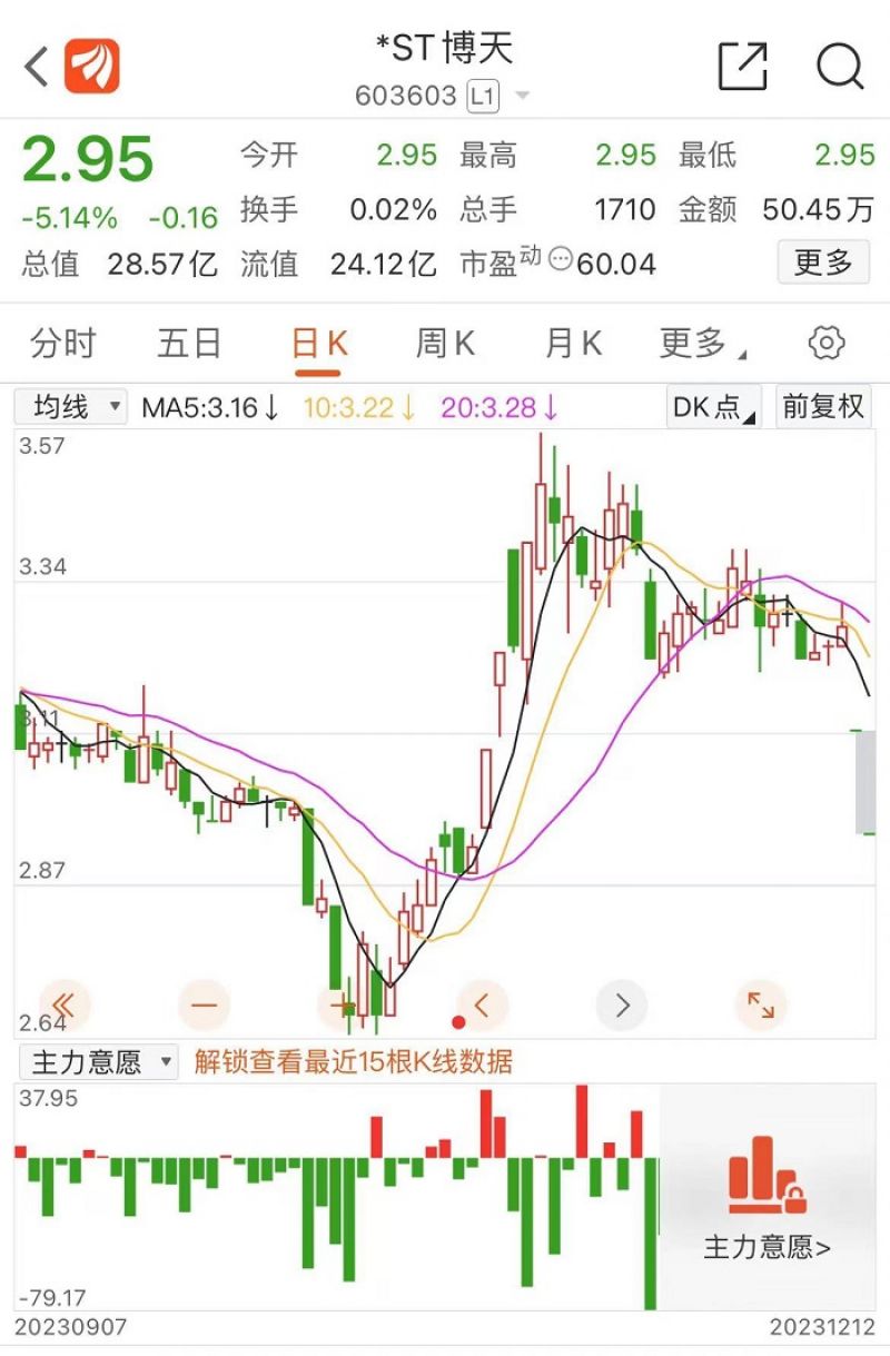 上述事件发生后,本周开盘后,*ST博天,连续三日上演“一”字跌停,资金排队“出逃”,截至12月13日收盘,公司股价报2.8元/股,下跌5.08%,跌破3元/股。