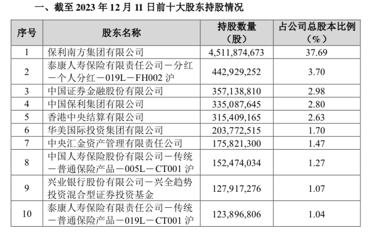 公告显示,12月11日保利发展登记在册的前十大股东和前十大无限售条件股东的名称、持股数量和持股比例情况如下: