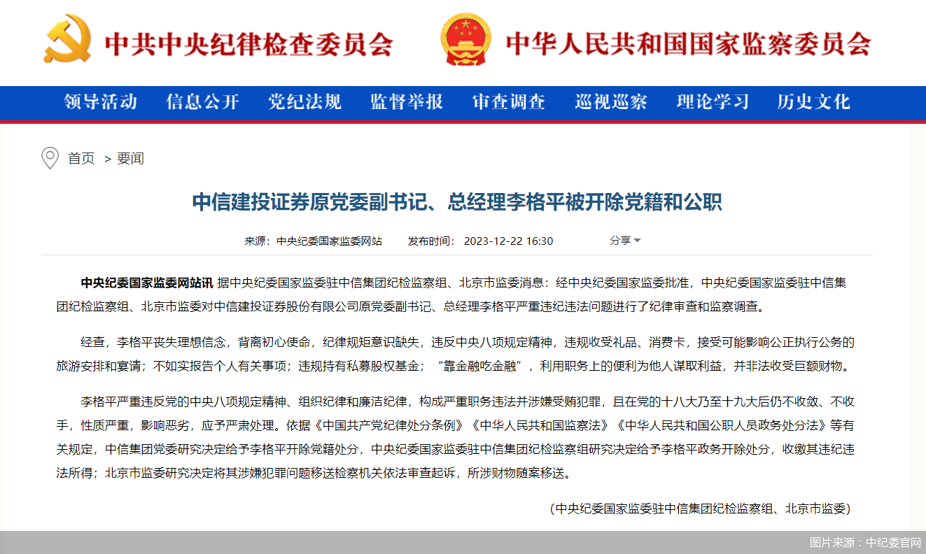 中信建投证券原党委副书记、总经理李格平被开除党籍和公职