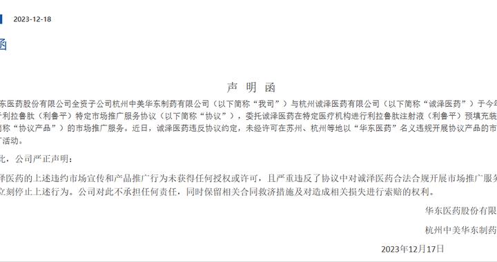 华东医药股份有限公司发布声明函称,华东医药股份有限公司全资子公司杭州中美华东制药有限公司(以下简称“我司”)与杭州诚泽医药有限公司(以下简称“诚泽医药”)于今年12月签署了关于利拉鲁肽(利鲁平)特定市场推广服务协议(以下简称“协议”),委托诚泽医药在特定医疗机构进行利拉鲁肽注射液(利鲁平)预填充装和笔芯(以下简称“协议产品”)的市场推广服务。近日,诚泽医药违反协议约定,未经许可在苏州、杭州等地以“华东医药”名义违规开展协议产品的市场宣传和产品推广活动。