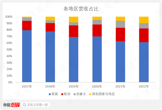 2017-2022年,北美和欧洲市场合计营收占比一直高于90%,其中美国一直是公司最大收入来源地。美国市场营收占比虽然因加拿大和欧洲业务的推进而持续下降,但目前依然高于60%。