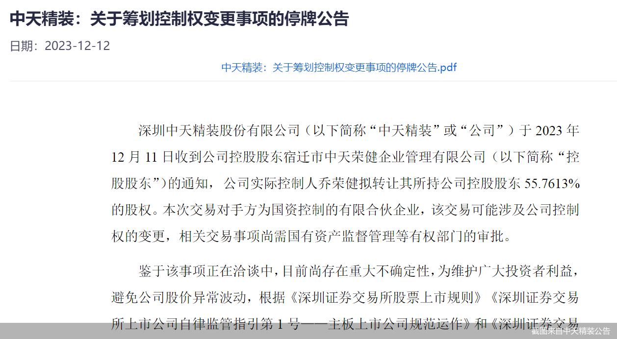 12月12日早间,中天精装披露公告称,公司于12月11日收到公司控股股东宿迁市中天荣健企业管理有限公司(以下简称“中天荣健”)的通知,公司实控人乔荣健拟转让其所持公司控股股东55.7613%的股权。本次交易对手方为国资控制的有限合伙企业,该交易可能涉及公司控制权的变更,相关交易事项尚需国有资产监督管理等有权部门的审批。
