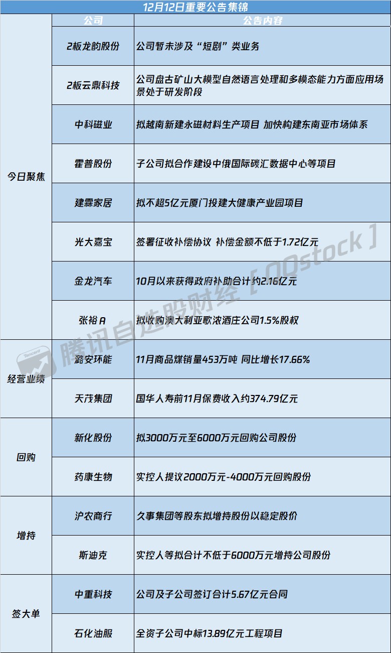 A股公告精选 | 龙韵股份(603729.SH)暂未涉及“短剧”类业务 金龙汽车(600686.SH)10月来获政府补助约2.16亿