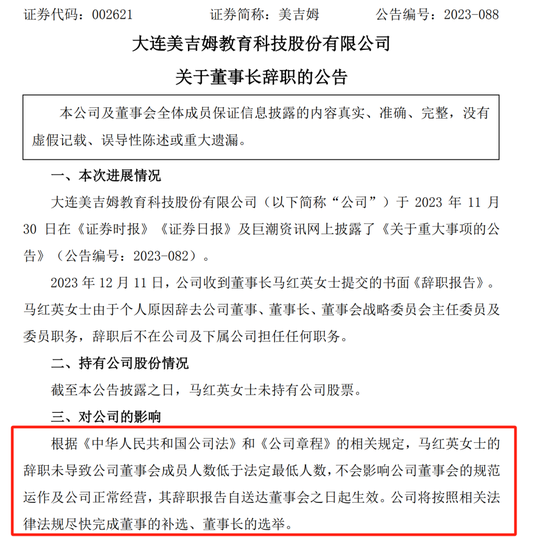 值得一提的是,美吉姆此前曾于11月29日晚间公告,近日,公司通过电话、微信等方式,均无法与董事长马红英取得联系。经与马红英家人沟通,截至目前,公司尚不确定无法与马红英取得联系的具体原因。