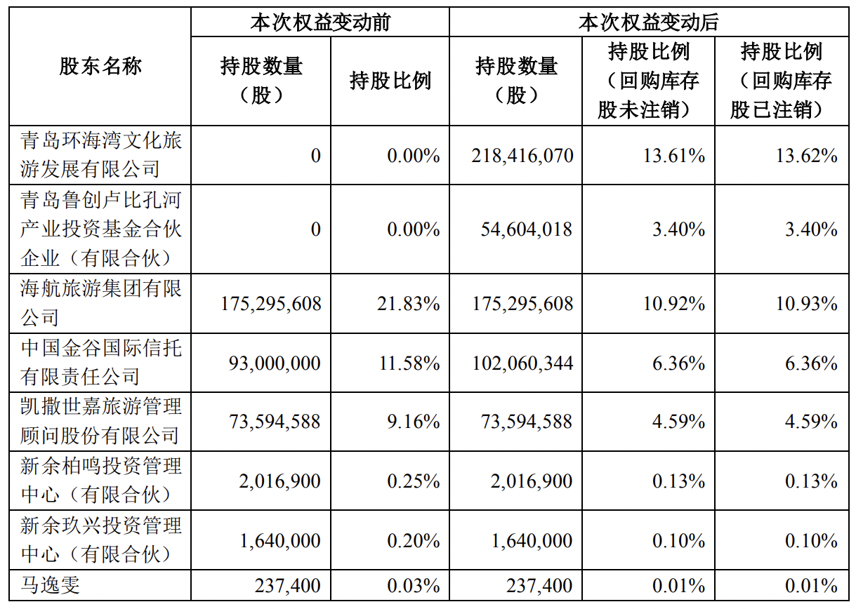 公告显示,本次权益变动原因系执行《凯撒同盛发展股份有限公司及其六家子公司重整计划》(以下简称“《重整计划》”),《重整计划》执行完毕后,*ST凯撒控股股东将由凯撒世嘉旅游管理顾问股份有限公司(以下简称“凯撒世嘉”)变更为青岛环海湾文化旅游发展有限公司(以下简称“环海湾文旅”),实际控制人将变更为青岛市市北区国有资产运营发展中心。