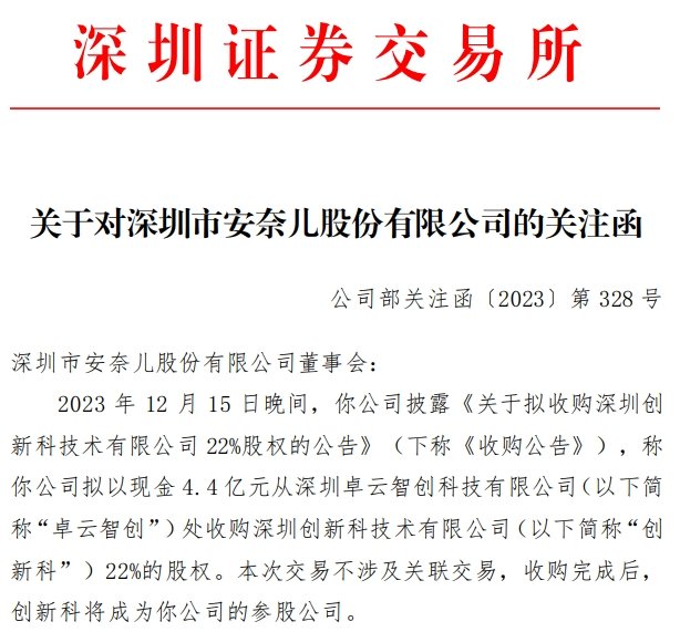 中新经纬12月16日电 16日,深交所向安奈儿下发关注函,要求说明收购创新科股权、签署算力平台采购合同等情况。