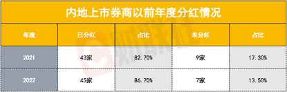 从往年来看,证券行业的分红动能一直较高。根据证券业协会2024年1月公布的最新证券公司名录,记者提取了52家内地上市券商及主体在2021和2022年的分红情况。2021年度,有43家进行了年度分红,占比82.70%;7家未分红,占比13.46%,未分红的券商及主体分别是浙商证券、华创云信、国盛证券、太平洋证券、天风证券、兴业证券、锦龙股份,另外2家信达证券和首创证券由于上市时间还较短,因此2021年度未有分红数据。