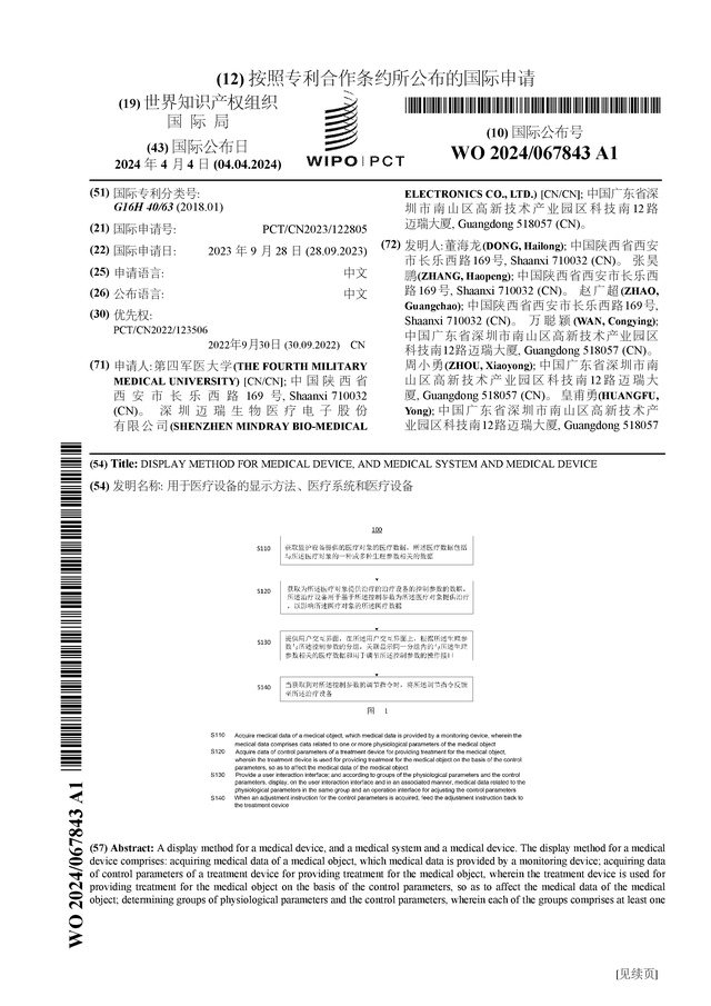 迈瑞医疗公布国际专利申请:“用于医疗设备的显示方法、医疗系统和医疗设备”