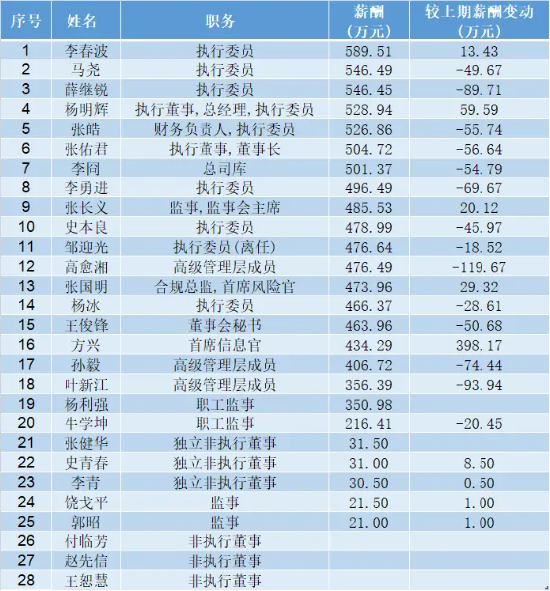 最高的是执行委员李春波,薪酬589.51万元,较上期增加13.43万元。执行董事兼总经理兼执行委员杨明辉,薪酬528.94万元,排第3位,增加59.59万元。监事兼监事会主席张长义,薪酬485.53万元,排第9位,增加20.12万元。合规总监兼首席风险官张国明,薪酬473.96万元,排第13位,增加29.32万元。首席信息官方兴,薪酬434.29万元,排在第16位。这五位高层薪酬较上期增加超10万元。