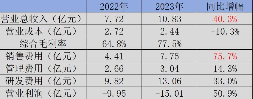 整个2023年,荣昌生物共取得营收10.83亿元,同比增长40.3%,延续了公司营收持续增长的趋势。不过为了实现这样的营收增长,荣昌生物付出了75.7%的销售费用增长。以75.7%的营销费用增长,驱动40.3%的产品增长,这样的销售结果显然是难言成功的。