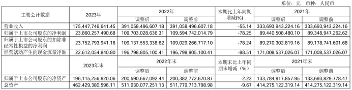 挖贝网3月29日,中远海控 近日发布2023年年度报告,报告期内公司实现营业收入175,447,746,641.45元,同比下滑55.14%;归属于上市公司股东的净利润23,860,257,490.68元,同比下滑78.25%。