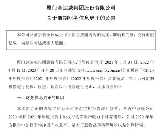 金达威公告显示,公司在对定期报告进行复核、检查中发现公司2020年和2021年年度报告中加权平均净资产收益率计算错误,2022年年度报告中加权平均净资产收益率、基本每股收益和稀释每股收益计算错误。