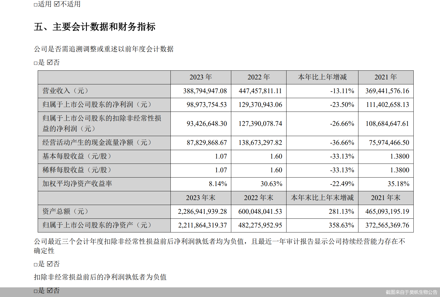 财务数据显示,2023年,昊帆生物实现的营业收入约为3.89亿元,同比下降13.11%;对应实现的归属净利润约为9897.38万元,同比下降23.5%。
