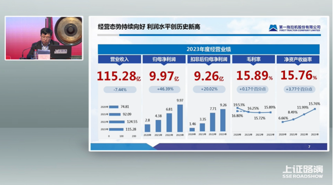 据魏涛介绍,2023年,一拖股份实现营业收入115.28亿元,同比下降7.44%,在收入下降的情况下,公司实现归属于上市公司股东净利润9.97亿元,同比增长46.39%。扣除非经常性损益后的归母净利润9.26亿元,同比增长20.02%,利润水平创历史新高。