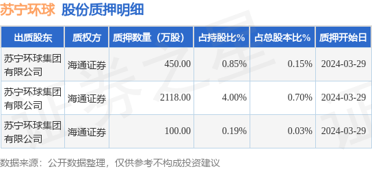 证券之星消息,苏宁环球(000718)4月1日公开信息显示,股东苏宁环球集团有限公司向海通证券合计质押2668.0万股,占总股本0.88%。质押详情见下表: