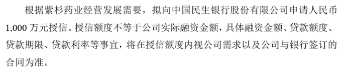 紫杉药业拟向中国民生银行股份有限公司申请1000万授信
