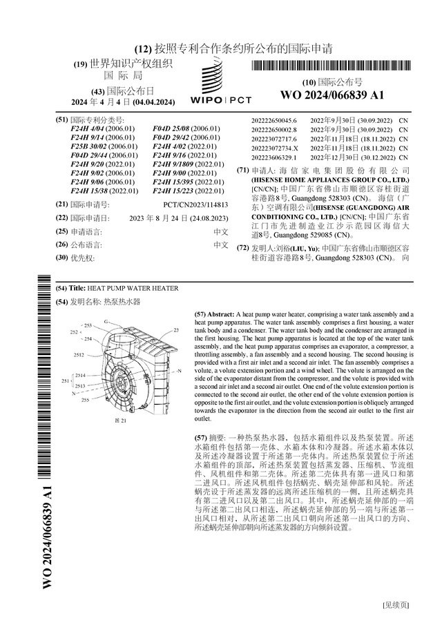 证券之星消息,根据企查查数据显示海信家电(000921)公布了一项国际专利申请,专利名为“热泵热水器”,专利申请号为PCT/CN2023/114813,国际公布日为2024年4月4日。