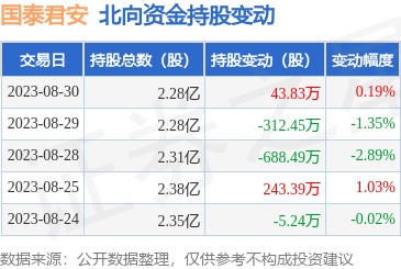 8月30日北向资金增持43.83万股国泰君安。近5个交易日中,获北向资金减持的有3天,累计净减持718.96万股。近20个交易日中,获北向资金增持的有16天,累计净增持3024.33万股。截至目前,北向资金持有国泰君安2.28亿股,占公司A股总股本的2.56%。