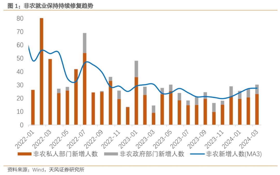 2024年3月美国非农就业录得30.3万人,大幅高于预期的20万人,亦高于前值的27.0万人;私人部门新增就业23.2万人。3个月月均视角下,新增非农就业进一步上行至27.6万人,整体非农新增就业持续修复的趋势仍在延续。