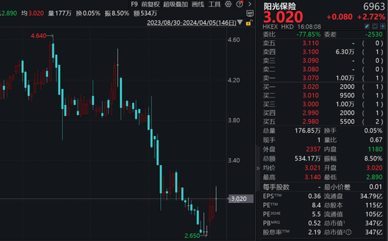 2024年一季度,阳光保险H股股票价格出现较大波动,收盘价从2023年12月29日的4.35港元/股跌至2024年3月28日的2.69港元/股。