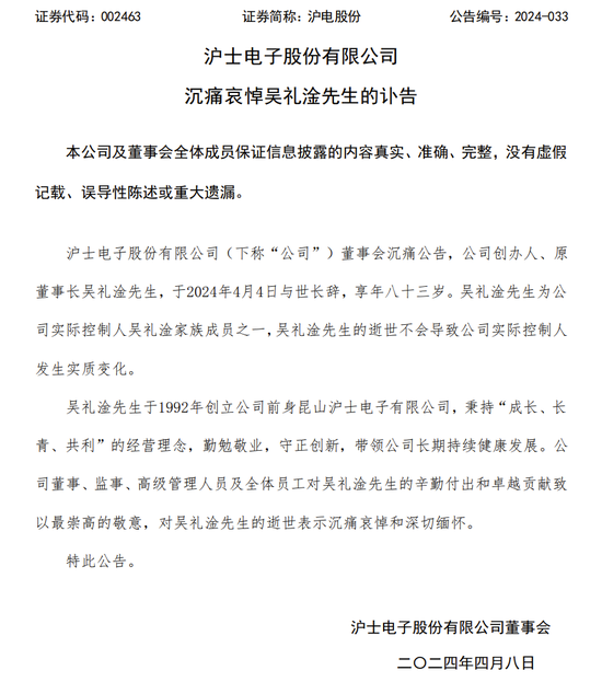 吴礼淦先生于1992年创立公司前身昆山沪士电子有限公司,秉持“成长、长青、共利”的经营理念,勤勉敬业,守正创新,带领公司长期持续健康发展。公司董事、监事、高级管理人员及全体员工对吴礼淦先生的辛勤付出和卓越贡献致以最崇高的敬意,对吴礼淦先生的逝世表示沉痛哀悼和深切缅怀。