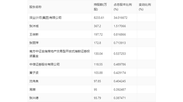 年报显示,2023年年末公司十大流通股东中,新进股东为南方中证全指房地产交易型开放式指数证券投资基金、中信证券股份有限公司、黄子贤、周薇、张兴德,取代了三季度末的UBS AG、中信里昂资产管理有限公司-客户资金-人民币资金汇入、J.P.Morgan Securities PLC-自有资金、法国兴业银行、MORGAN STANLEY & CO. INTERNATIONAL PLC.。在具体持股比例上,王俊新持股有所上升。