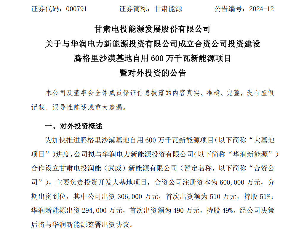 近日,甘肃电投能源发展股份有限公司(以下简称“甘肃能源”)发布《关于与华润电力新能源投资有限公司成立合资公司投资建设腾格里沙漠基地自用600万千瓦新能源项目暨对外投资的公告》。